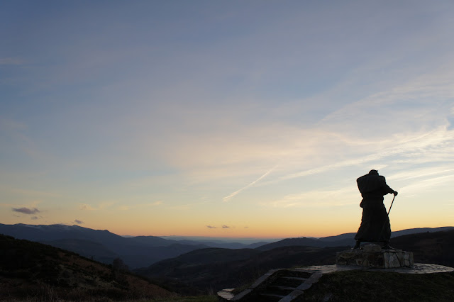 A 4 km de O Cebreiro llegamos al Alto de San Roque, donde en 1993 se colocó una escultura en bronce de un peregrino avanzando contra el viento; una obra emblemática del escultor gallego José María Acuña.